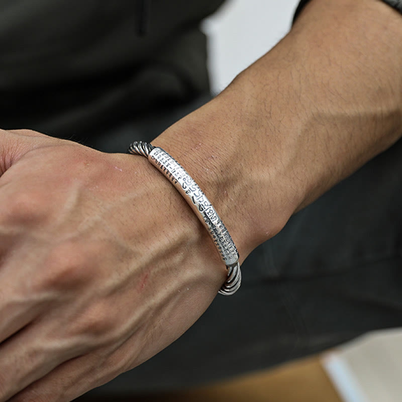 Buddha Stones 999 Sterling Silver Six True Words Heart Sutra Braided Design Lotus Protection Bracelet Bangle