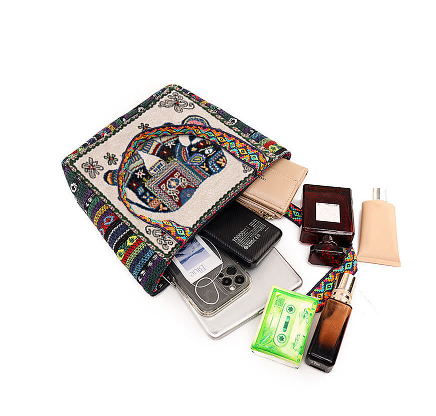 Buddha Stones Elephant Butterfly Embroidered Large Capacity Canvas Tote Bag Shoulder Bag