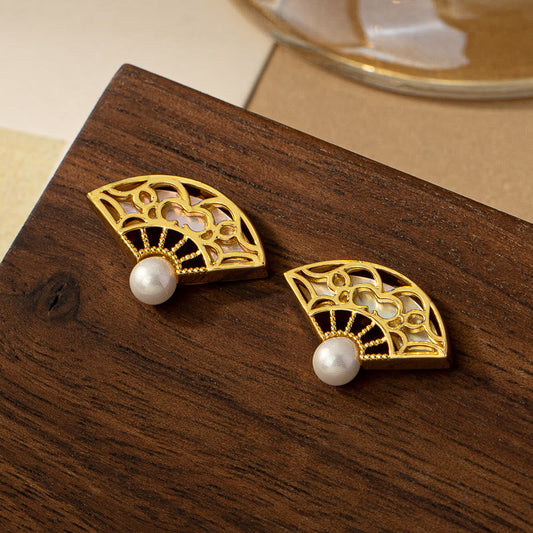 Buddha Stones Copper Fan Auspicious Clouds Pearl Healing Drop Earrings