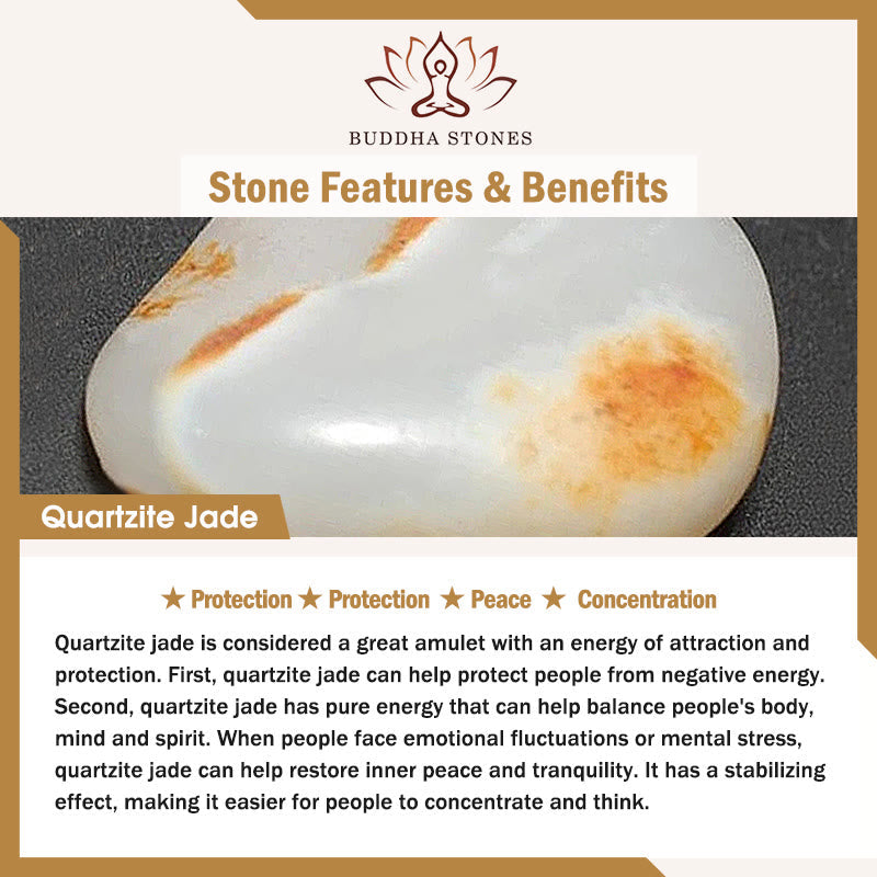 Quartzite jade is considered a great amulet with an energy of attraction and protection. First, quartzite jade can help protect people from negative energy. Second, quartzite jade has pure energy that can help balance people's body, mind and spirit. When people face emotional fluctuations or mental stress, quartzite jade can help restore inner peace and tranquility. It has a stabilizing effect, making it easier for people to concentrate and think.