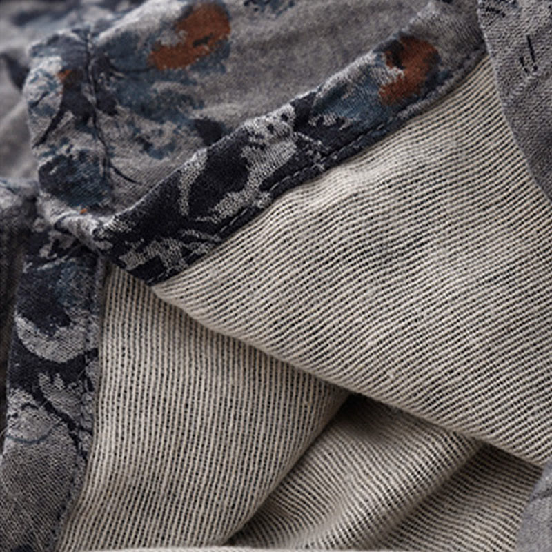Buddha Stones Casual Small Floral Pattern Crew Neck Cotton Linen Midi Dress With Pockets