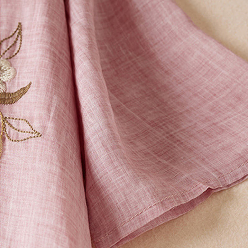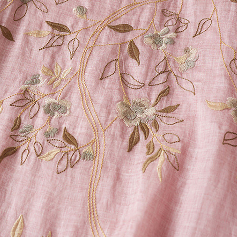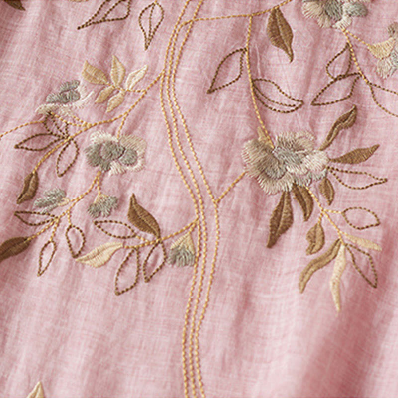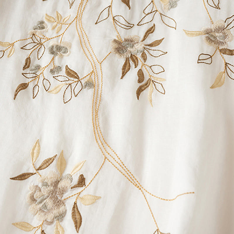 Buddha Stones Embroidered Leaf Crew Neck Half Sleeve Cotton Fiber Midi Dress