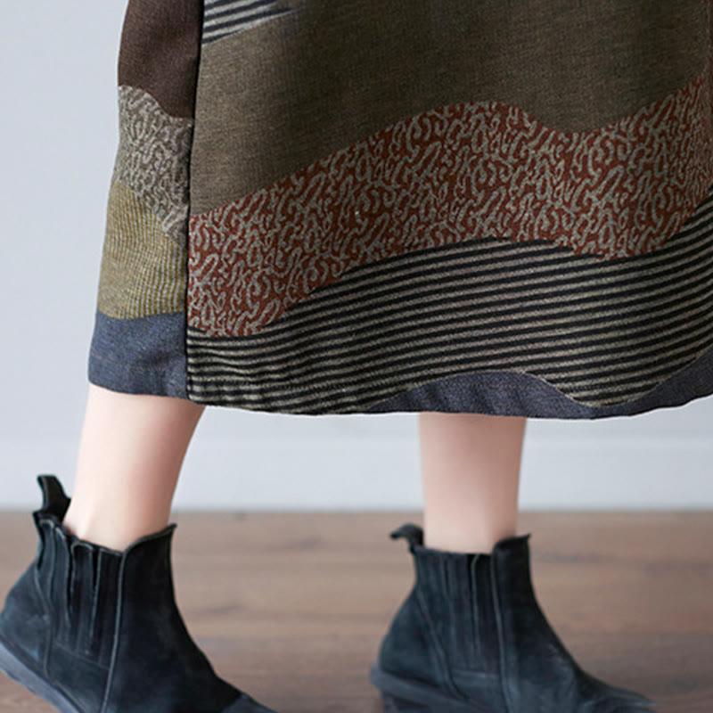Buddha Stones Ethnic Printing Striped Pattern Long Sleeve Cotton Linen Midi Dress With Pockets