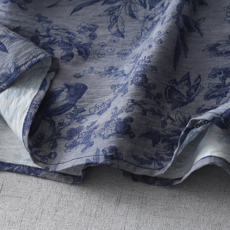 Buddha Stones Flower Leaf Print Frog-Button Half Sleeve Mandarin Collar Cotton Midi Dress