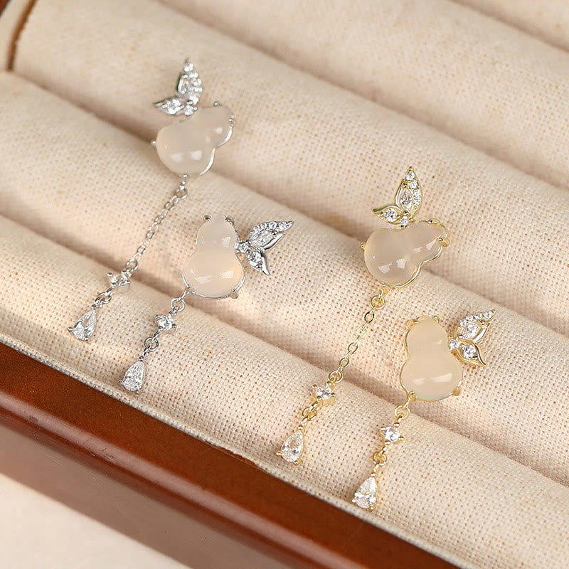 Buddha Stones Hetian Jade Magnolia Chalcedony 925 Sterling Silver Butterfly Gourd Luck Earrings