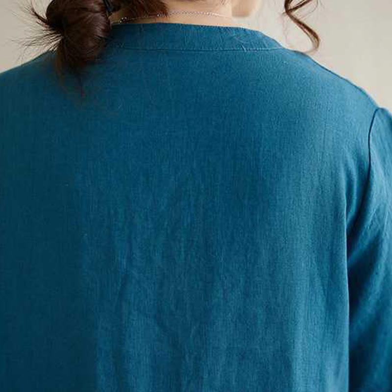 Buddha Stones Stand Collar Buttons Design Linen Short Sleeve Midi Dress With Pockets