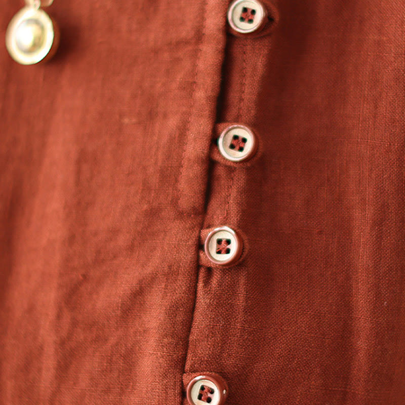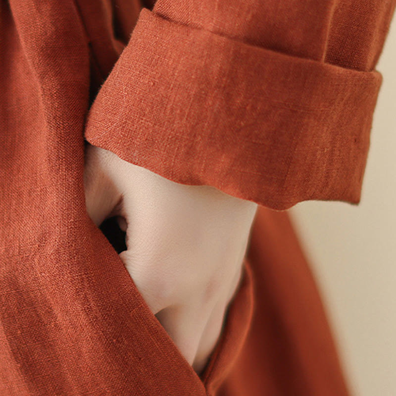 Buddha Stones OrangeRed Lace-Up Design Long Sleeve Cotton Midi Dress With Pockets