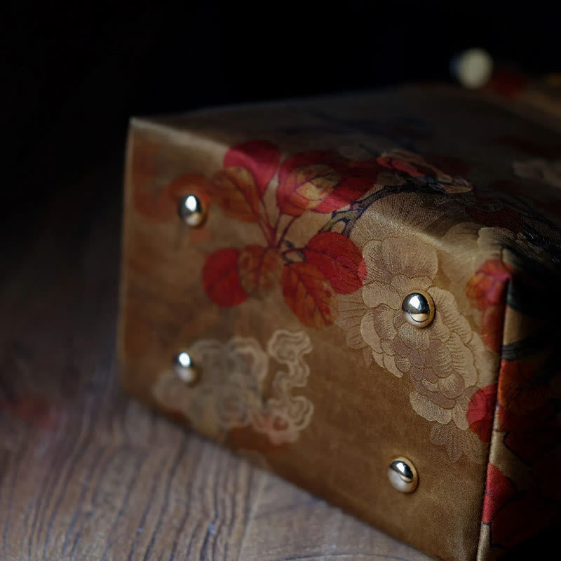 Buddha Stones Yellow Bird Branches Green Peony Flower Bamboo Handles Handbag