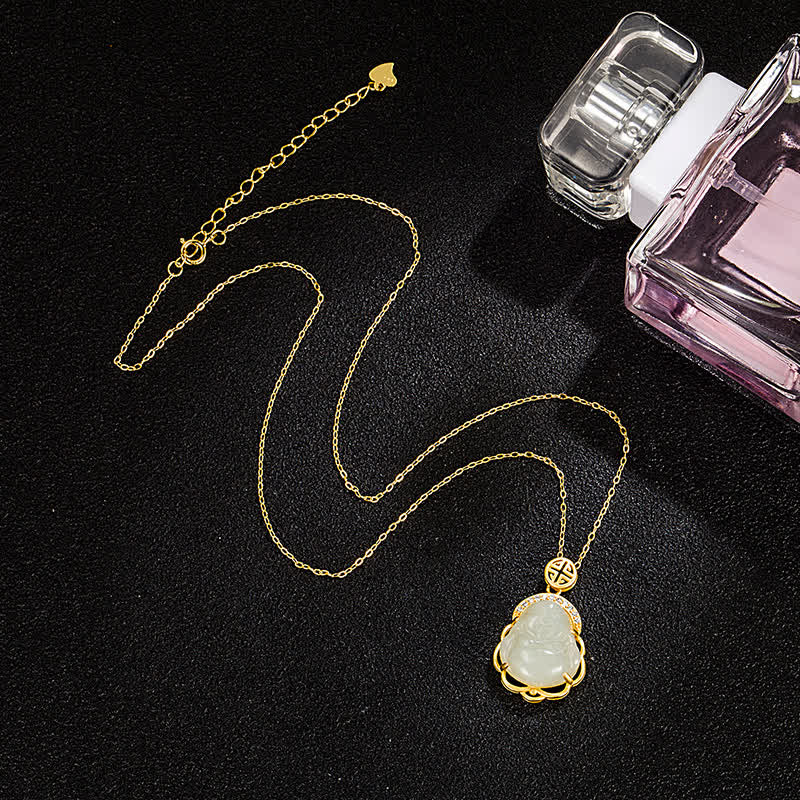Buddha Stones 925 Sterling Silver Laughing Buddha Hetian White Jade Protection Necklace Pendant