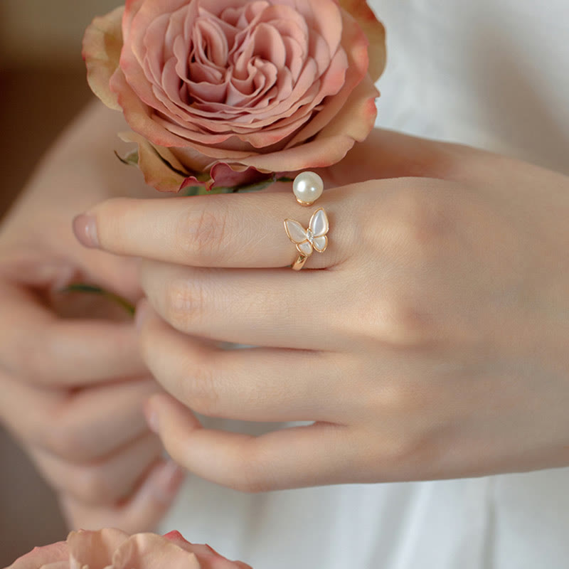 Buddha Stones 14K Gold Plated Copper Pearl Tridacna Stone Butterfly Blessing Ring Bracelet Necklace Pendant Earrings Set
