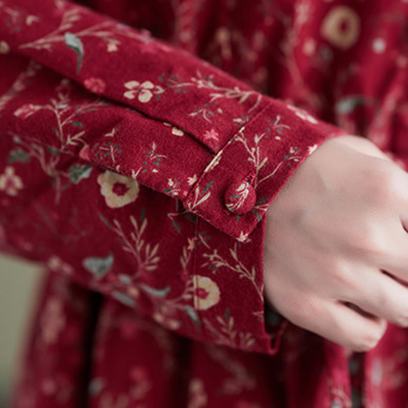 Buddha Stones Ethnic Printing Drawstring Long Sleeve Cotton Linen Midi Dress With Pockets