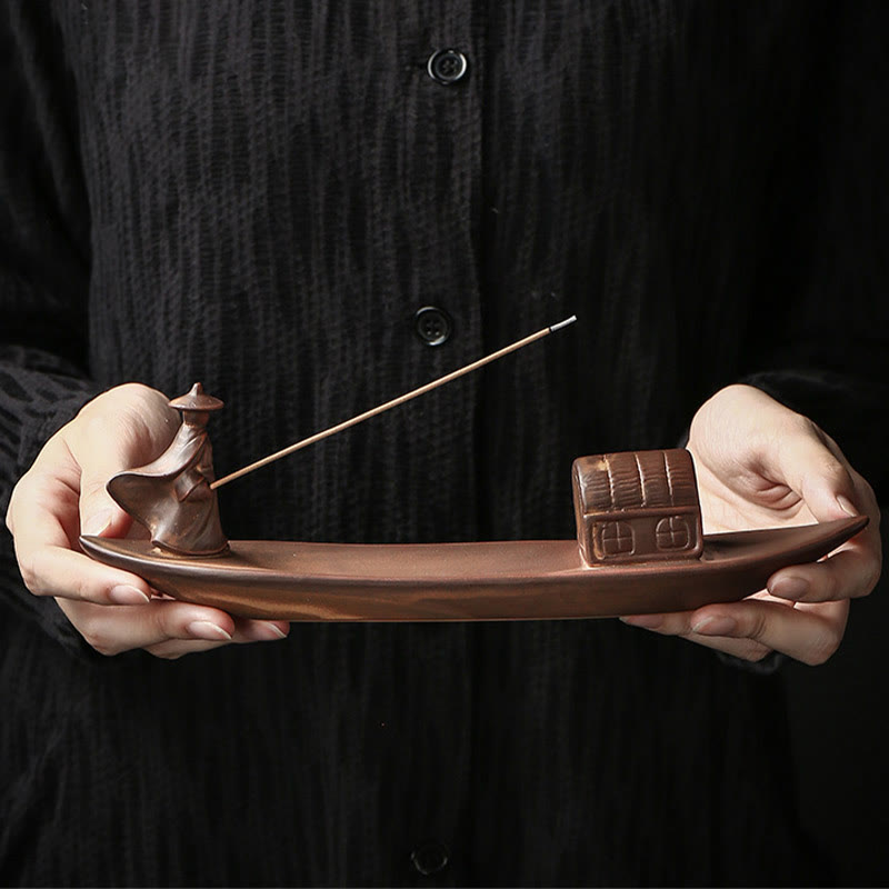 Buddha Stones Fisherman Fishing Boat Bamboo Buddha Hand Lotus Spiritual Healing Ceramic Stick Incense Burner Decoration