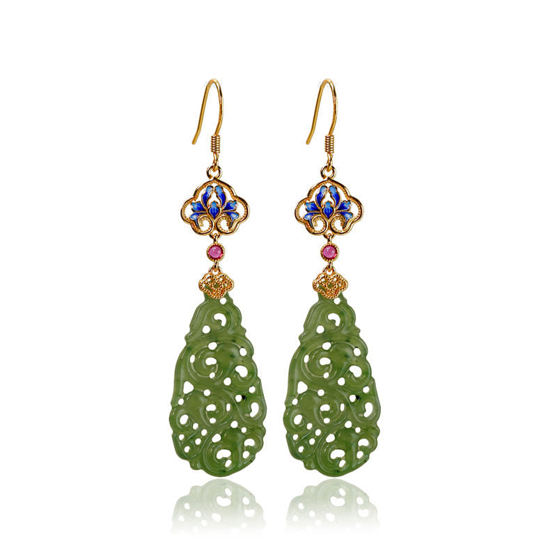 Buddha Stones Hollow Hetian Jade Enamel 925 Sterling Silver Prosperity Earrings
