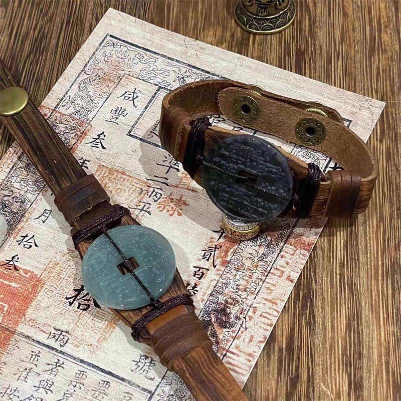 Buddha Stones Jade Mountain Ghosts Spend Money Prosperity Leather Watch Band Bracelet