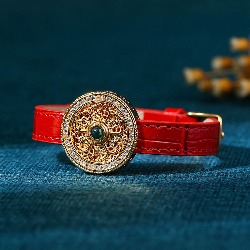 Buddha Stones Six True Words Eight Treasures Compass Jade 24K Gold Plated Luck Leather Bracelet