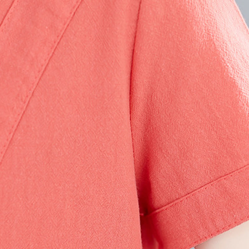 Buddha Stones Summer Casual Plain Lace-Up Design Crew Neck Short Sleeve Cotton Linen Midi Dress With Pockets