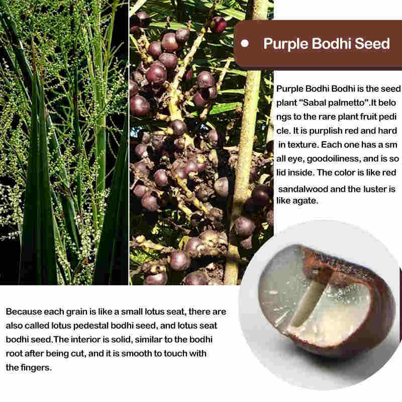 Purple Bodhi Bodhi is the seed of the palm plant "Sabal palmetto". It belongs to the rare plant fruit pedicle. It is purplish red and hard in texture. Each one has a small eye, good oiliness, and is solid inside. The color is like red sandalwood and the luster is like agate.