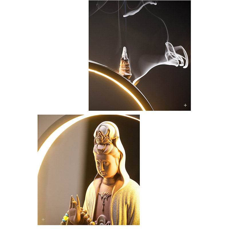 - When the incense cone is lit, the trajectory of smoke mimics a waterfall/cloud on the hill at the bottom of the statue.