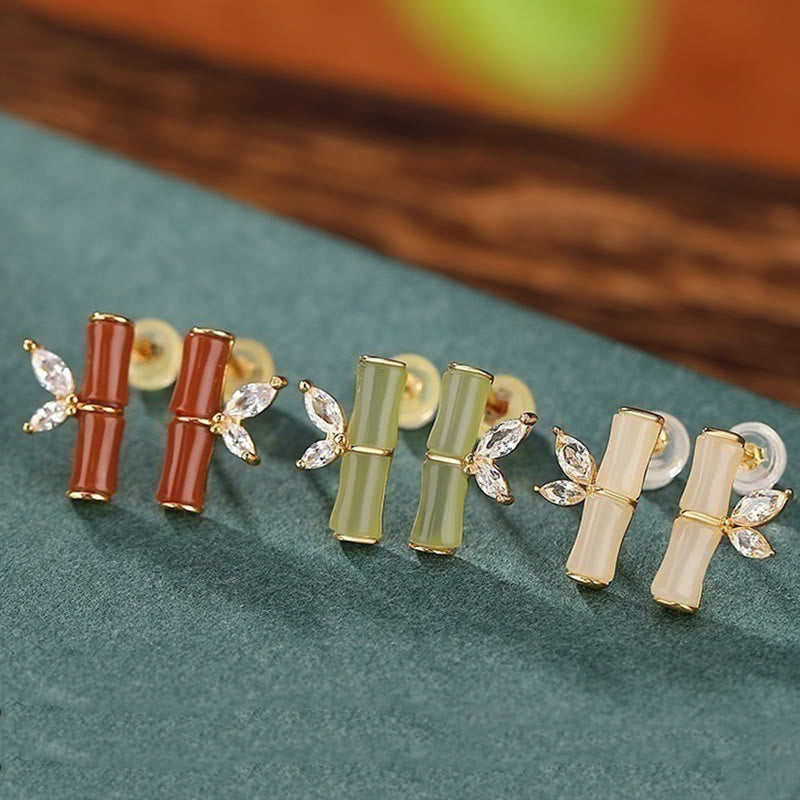 Buddha Stones 925 Sterling Silver Hetian Cyan Jade White Jade Red Agate Bamboo Pattern Luck Stud Earrings