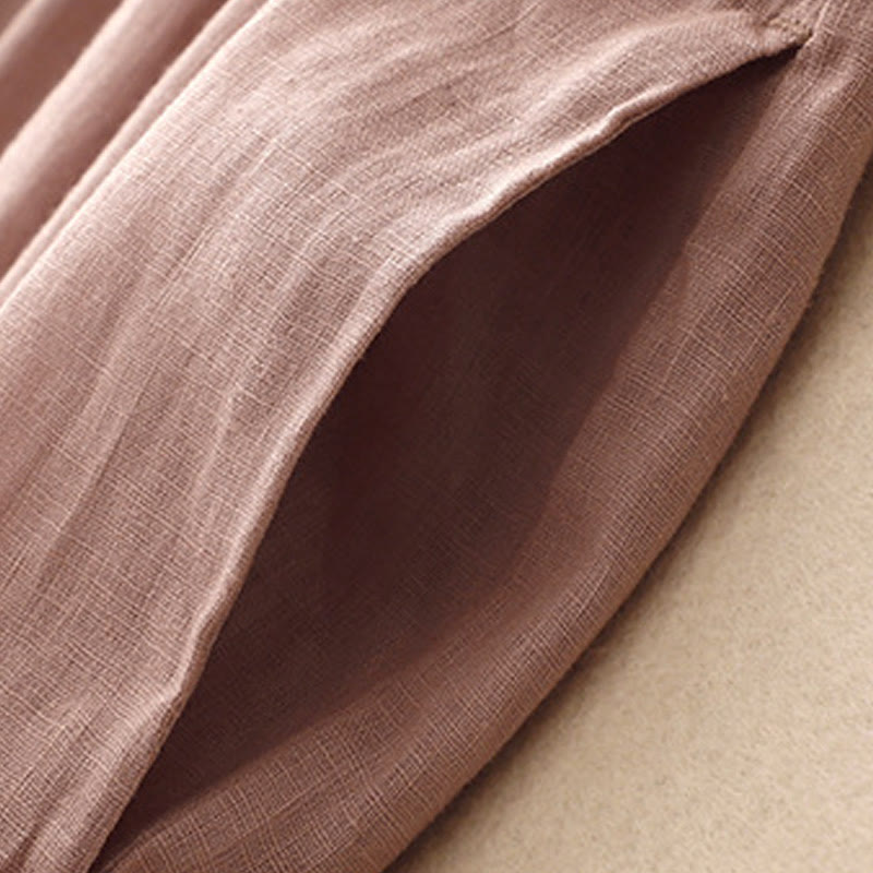 Buddha Stones Casual Artistic Solid Color Simple Design High Waist Short Sleeve Cotton Linen Midi Dress With Pockets