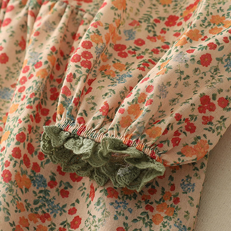 Buddha Stones Casual Floral Lace Crew Neck Balloon Long Sleeve Cotton Linen Midi Dress With Pockets