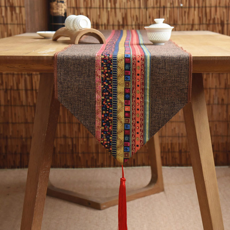 Buddha Stones Classic Chinese Style Lotus Koi Fish Flower Crane Calligraphy Enlightenment Cotton Linen Tassels Table Runner