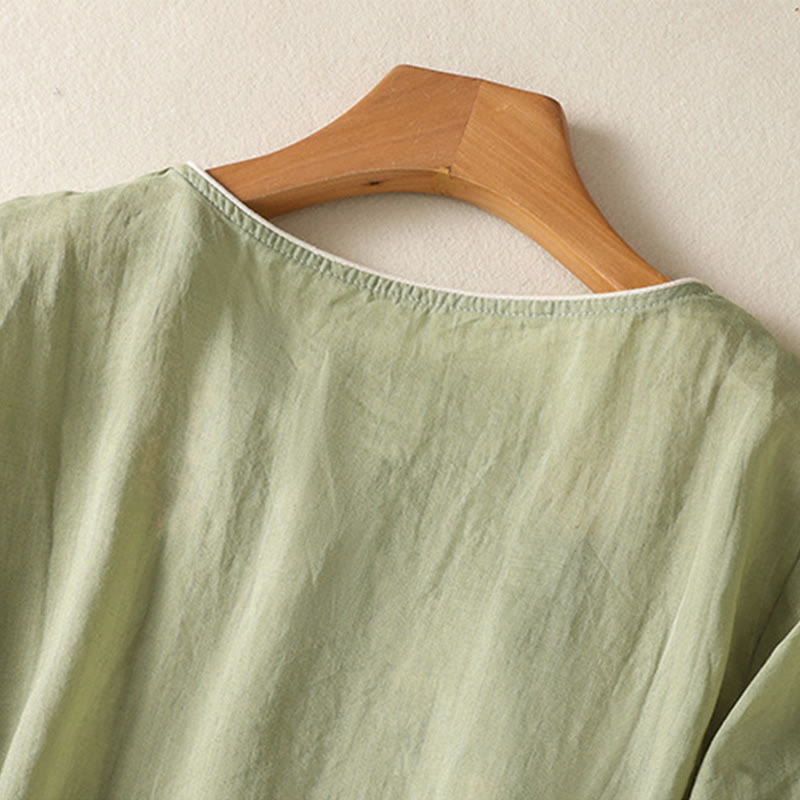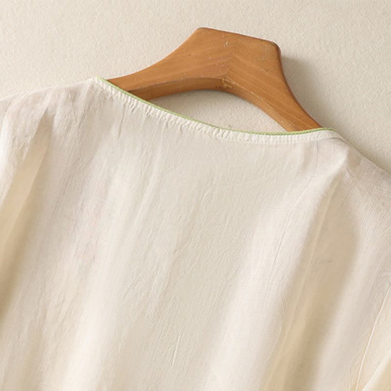 Buddha Stones Embroidery Flower Hem Slit Design Half Sleeve Cotton Linen Zen Midi Dress