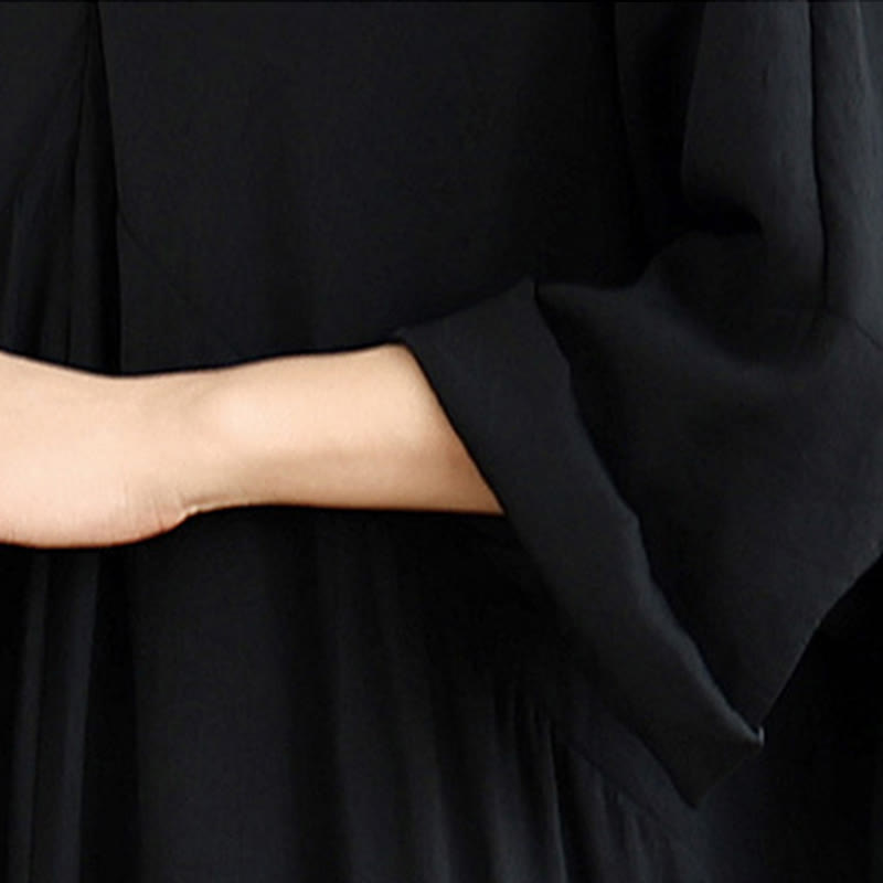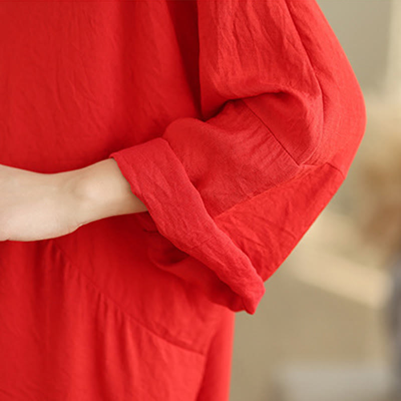 Buddha Stones Fall Pure Color V-Neck Long Sleeve Cotton Midi Dress