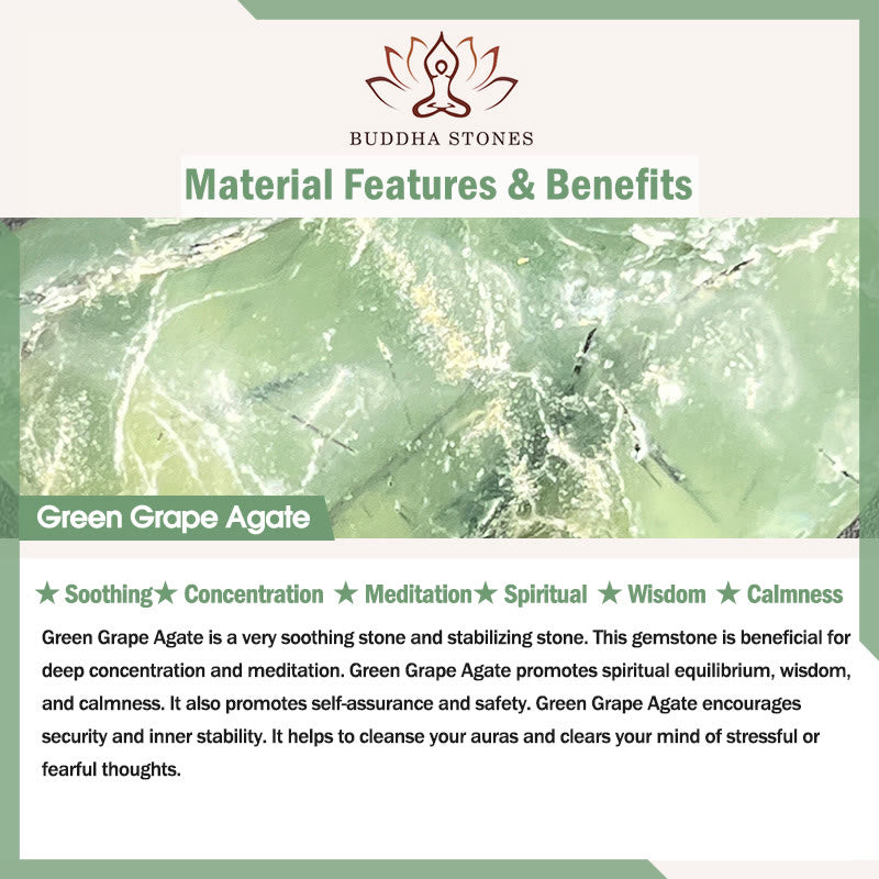 Green Grape Agate is a very soothing stone and stabilizing stone. This gemstone is beneficial for deep concentration and meditation. Green Grape Agate promotes spiritual equilibrium, wisdom, and calmness. It also promotes self-assurance and safety. Green Grape Agate encourages security and inner stability. It helps to cleanse your auras and clears your mind of stressful or fearful thoughts.