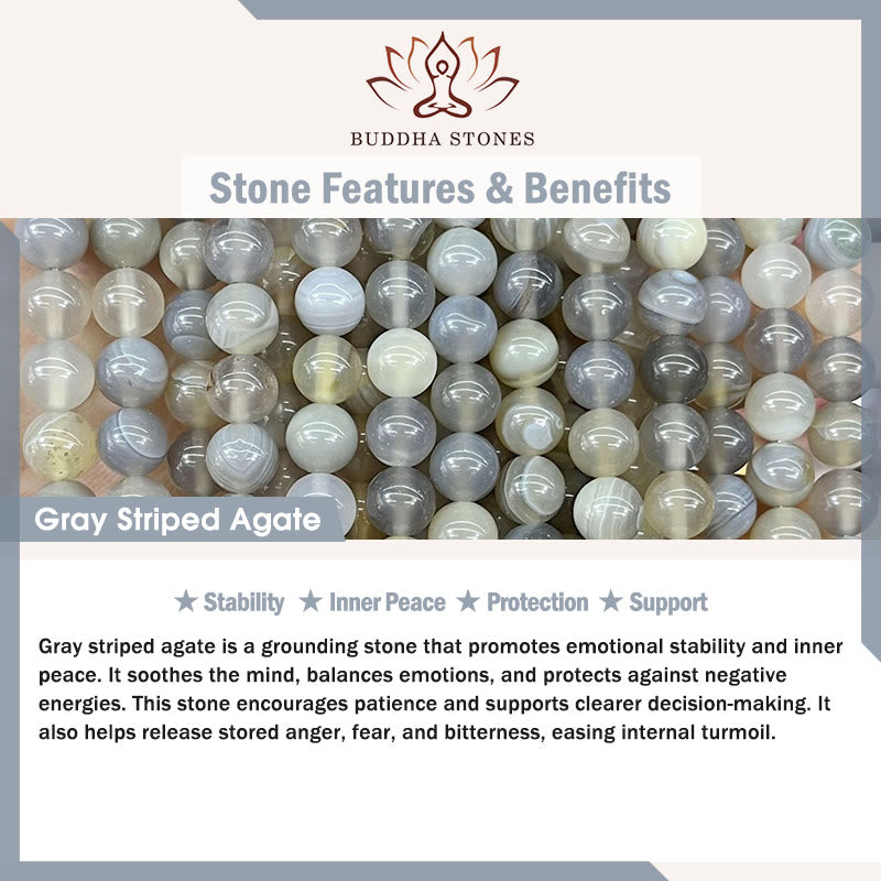 Gray striped agate is a grounding stone that promotes emotional stability and inner peace. It soothes the mind, balances emotions, and protects against negative energies. This stone encourages patience and supports clearer decision-making. It also helps release stored anger, fear, and bitterness, easing internal turmoil.