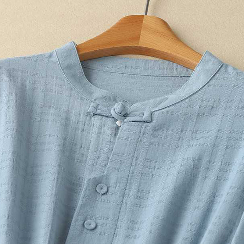 Buddha Stones Retro Solid Color Drawstring Frog-Button Design Long Sleeve Cotton Linen Midi Dress With Pockets
