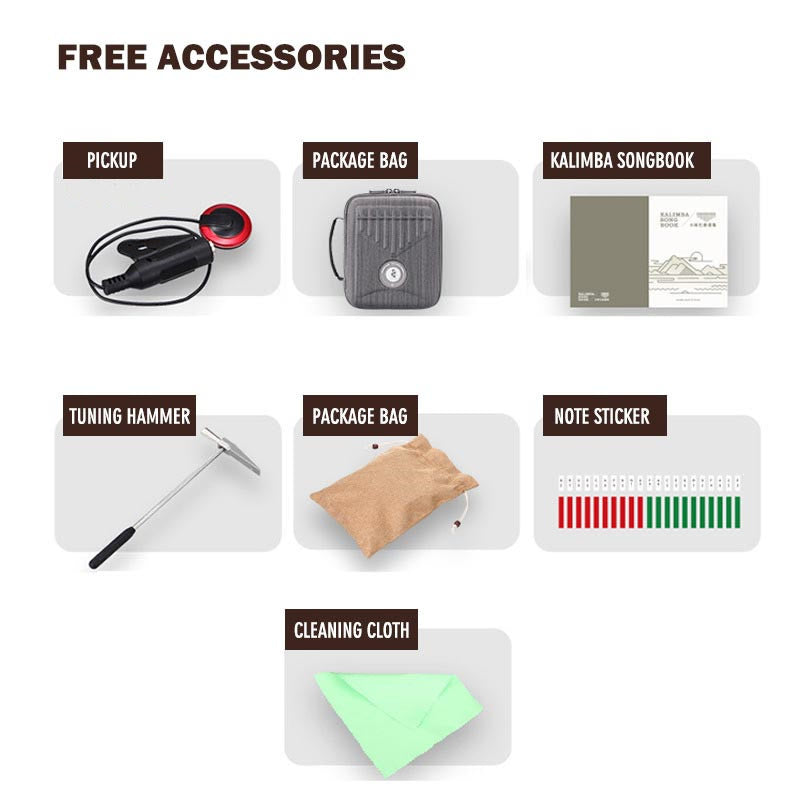 - Package Included: Kalimba*1, Pickup*1, Package Bag*1, Kalimba Songbook*1, Tuning Hammer*1, Storage Bag*1, Note Sticker*1, Cleaning Cloth*1
